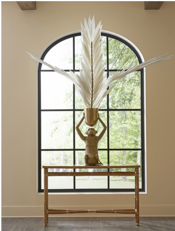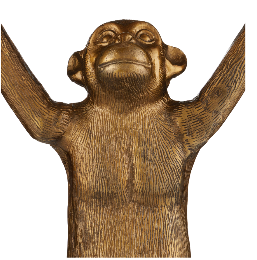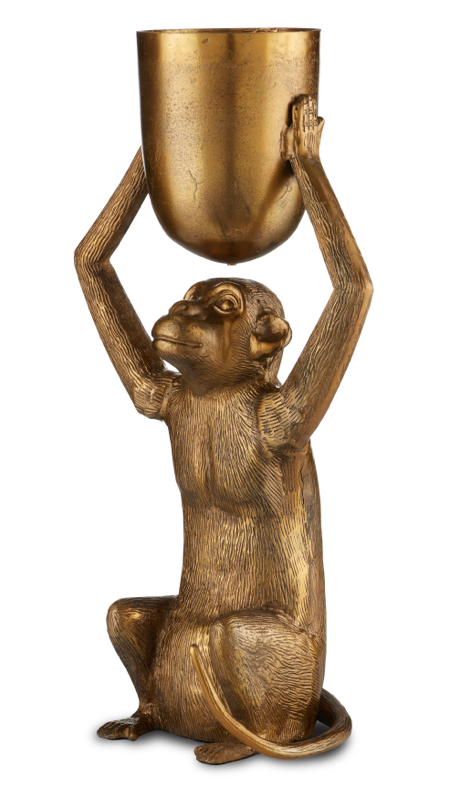 Inspired by a previous whimsical design that has been extremely popular, the Abu Gold Planter with its seated ape, molded in cast aluminum, lifts a plant-worthy vessel with little effort. The antique gold finish that covers the piece makes the gold planter read as if it has aged. The texture that is inherent in metal poured into molds in a foundry is evident on this piece, which brings it a vintage flair. It is best to use a liner with the solid metal planter when a planter has a drain hole.